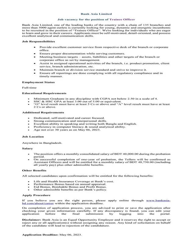 Bank asia limited offers an opportunity to build a life with growth and social status. Bank Asia limited is trying to provide a social status and feeling of self independence with its brand image. Bank Asia limitedly thinks that people are the center of success. Bank Asia is looking for young,energetic,proactive and honest people. If you think that,you are perfect to apply for this job. So,try to prepare to send your application. If you want to apply for this job, you should submit your application within a Specific Deadline. Bank asia limited job circular 2023 has been converted to an image file so that everyone can easily read and download this job circular. Bank Asia Limited job circular 2023 has been given below.