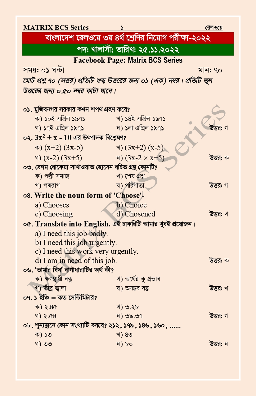 Bangladesh Railway Khalasi Exam Question Solution 2023